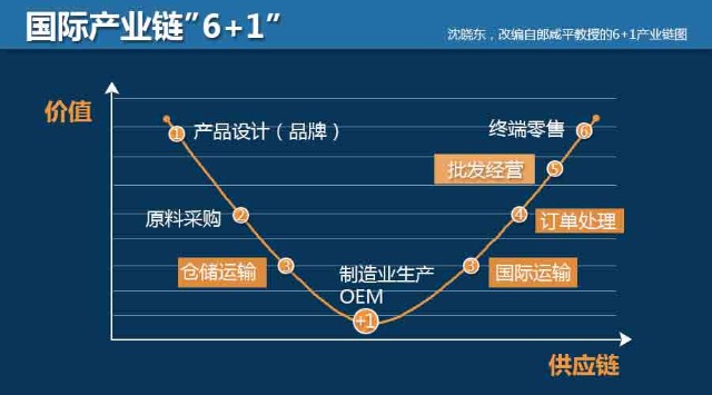 “6+1”产业链是由香港著名经济学家郎咸平教授提出的。“6”指的是:第一产品设计,第二原料采购,第三仓储运输,第四订单处理,第五批发经营,第六零售;“1”指的是:产品制造。